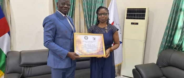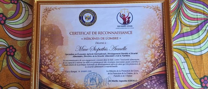 La Directrice de la sécurité alimentaire et de la nutrition, madame Armelle SIOPATHIS au Ministère de l’Agriculture et du Développement Rural (MADR) a eu l’honneur de faire partie des lauréates qui ont reçu un certificat de reconnaissance intitulé « Héroine de l’ombre » à l’initiative du Ministère de la Promotion du Genre en RCA, pour honorer les Femmes engagées dans différents ministères sectoriels à l’occasion de la cérémonie de ce dimanche 08 mars célébrant la Journée Internationale des Droits de la Femme (JIF) en présence du Premier Ministre, Félix MOLOUA, des membres du gouvernement et des agences des Nations-Unies.